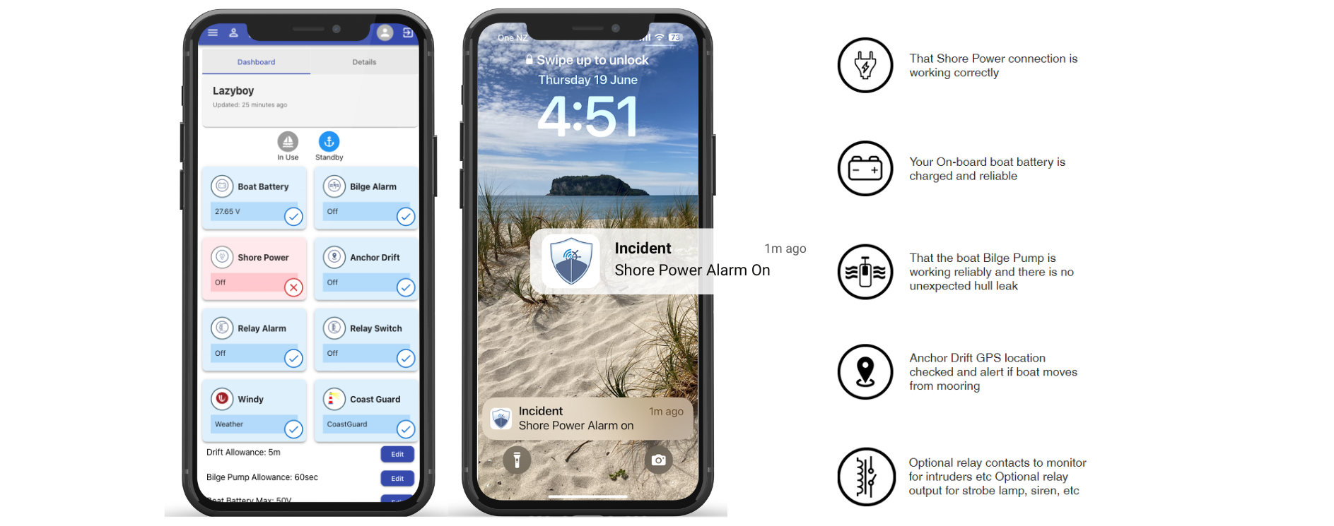 The smart Phone App manages your boat setup and receives status reports and alert messages.